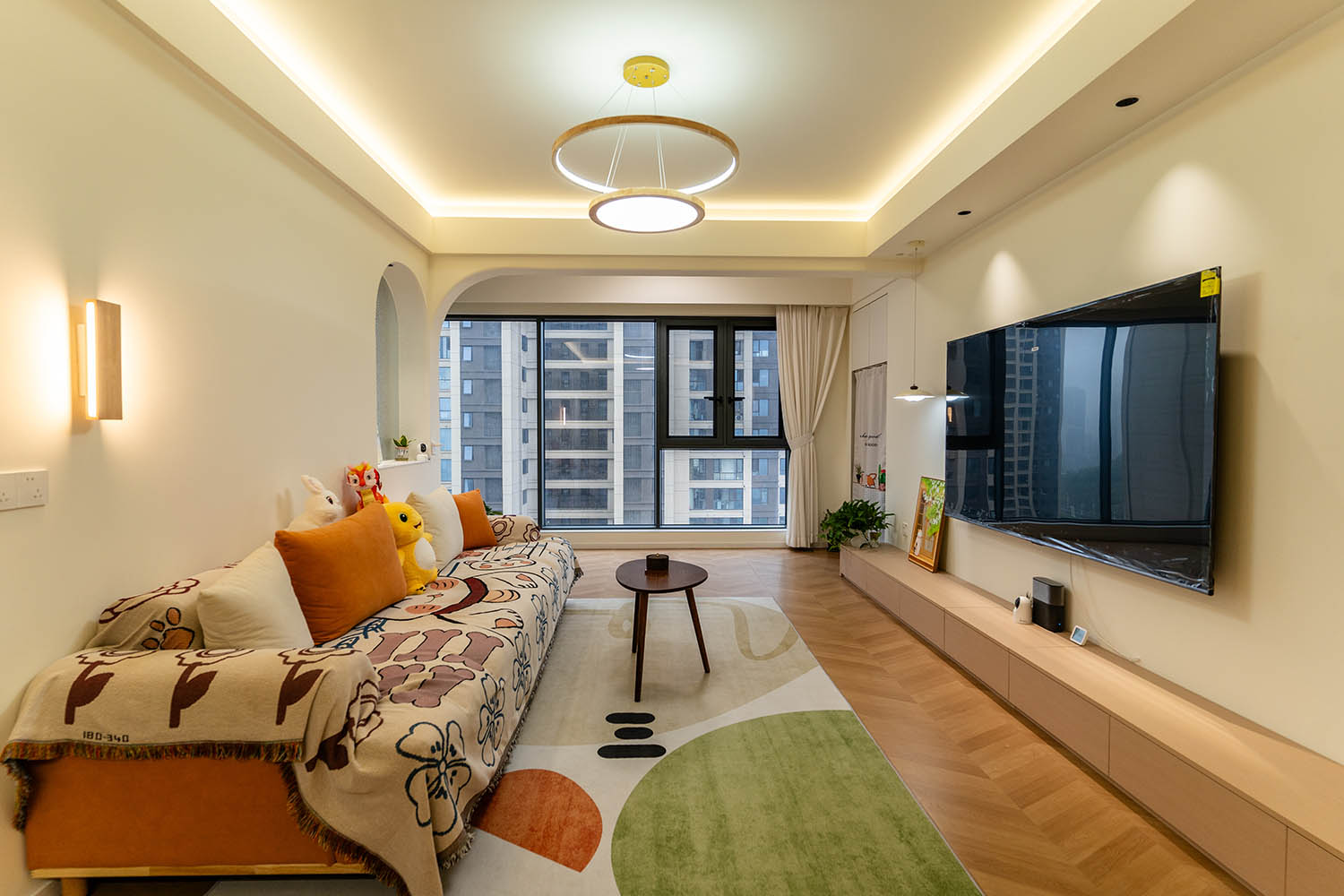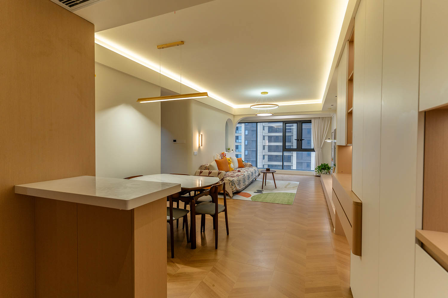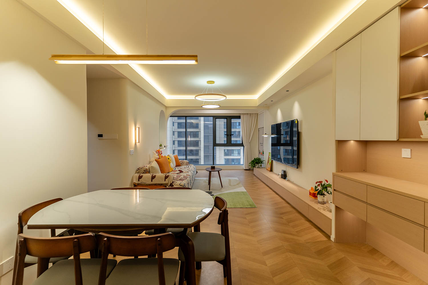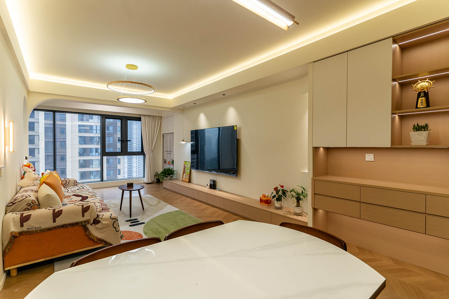 設計理念與空間基調(diào) 原木奶油風以低飽和度色彩、自然材質(zhì)與柔和線條為核心,在建發(fā)央著100㎡的戶型中,設計師通過奶油色基底與原木元素的融合,營造出溫暖治愈的居家氛圍。整體風格遵循“簡而不空”的原則,硬裝以簡約的幾何造型與流暢的動線為主,軟裝則強調(diào)材質(zhì)的天然感與舒適性,在實用性與美學之間找到完美平衡。 建發(fā)央著100㎡的原木奶油風,通過色彩、材質(zhì)與光影的巧妙平衡,將自然治愈感融入日常。既以開放式布局與智能收納滿足了現(xiàn)代生活的高效需求,又以弧形曲線與柔軟織物撫慰居者身心,真正詮釋了 “簡約中見細節(jié),溫柔中藏高級” 的居住理想。