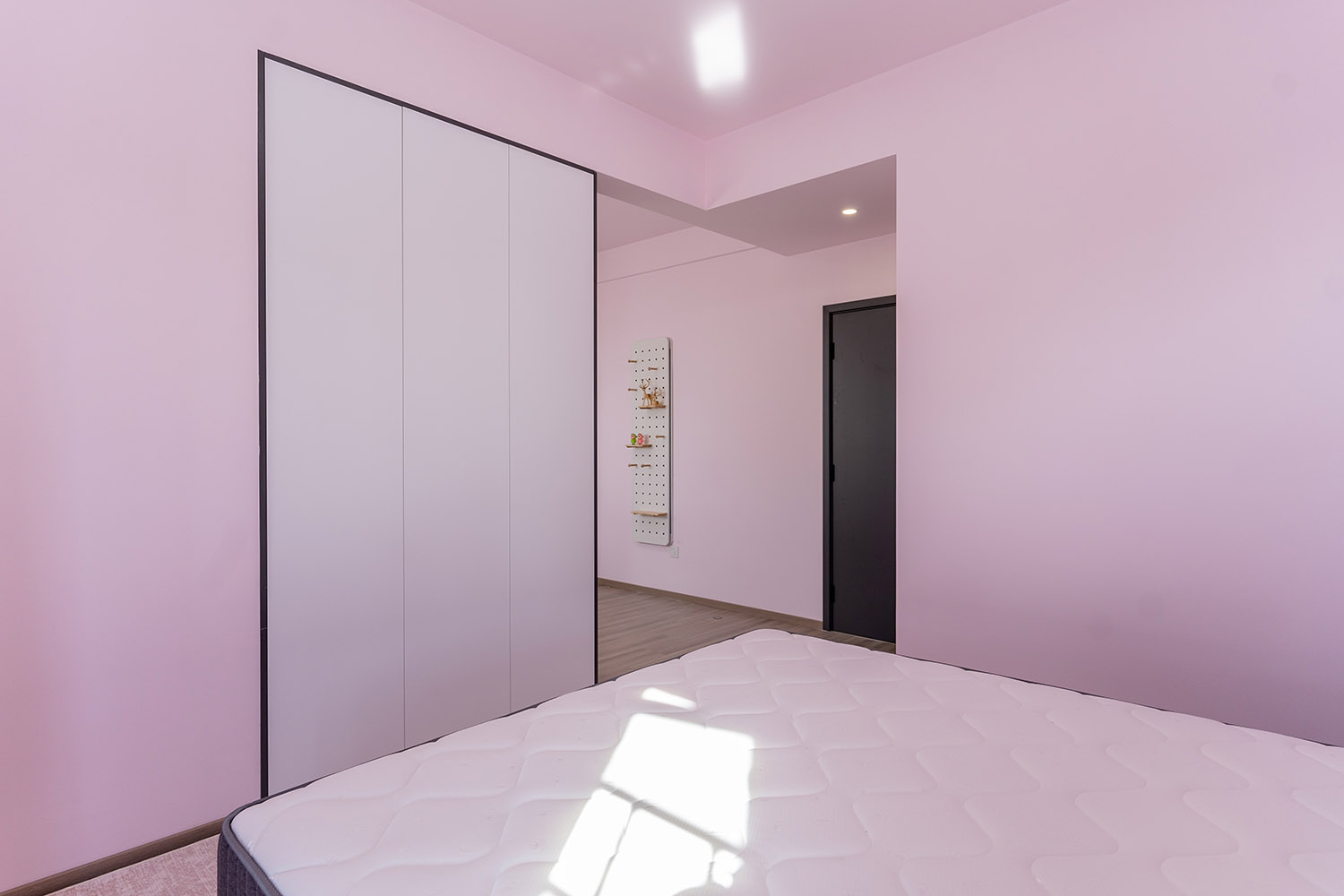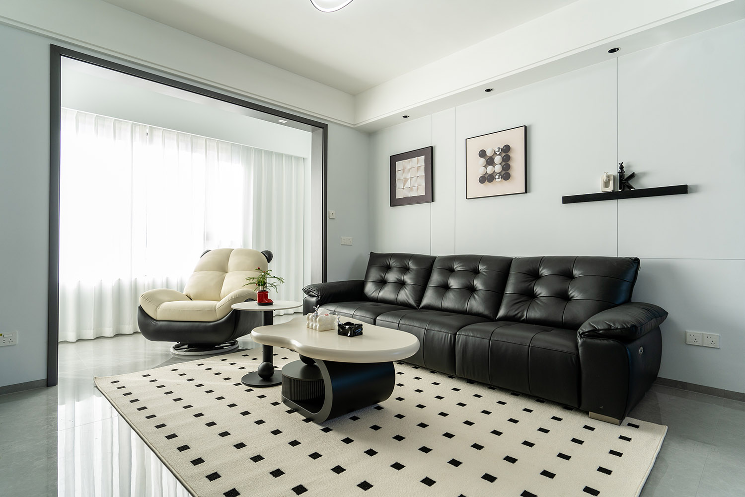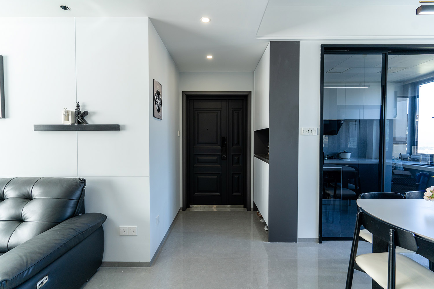 本案以“像素重組” 為核心理念,將136㎡的空間視作一個(gè)可以拆解與重構(gòu)的光影實(shí)驗(yàn)室。設(shè)計(jì)放棄所有裝飾性色彩,通過(guò)黑、白、灰三種基色的極致比例控制、不同材質(zhì)在單一色系下的質(zhì)感博弈以及精密計(jì)算的光影路徑,構(gòu)筑一個(gè)理性冷靜又充滿(mǎn)感知張力的未來(lái)居所。這里不是色彩的缺失,而是將色彩解構(gòu)為更本質(zhì)的光、影與肌理,讓居住回歸材料與空間的本質(zhì)對(duì)話(huà)。 通過(guò)極致的黑白灰控制與材料實(shí)驗(yàn),探索了現(xiàn)代居住的一種可能性:當(dāng)色彩被剝離,空間的形式、光影與質(zhì)感便被無(wú)限放大,人對(duì)空間的感知也因此變得更為敏銳和直接。它并非一個(gè)“冷淡”的空間,而是一個(gè)高度凝練、充滿(mǎn)理性之美并能包容居住者所有情緒與生活的“寧?kù)o背景板”。在這里,一幅畫(huà)、一株綠植、一本書(shū),乃至居住者本身,都將成為空間中最生動(dòng)、最富色彩的焦點(diǎn)。