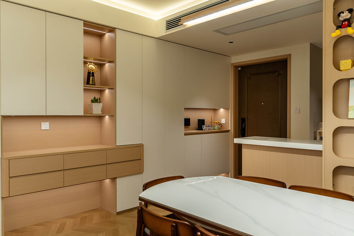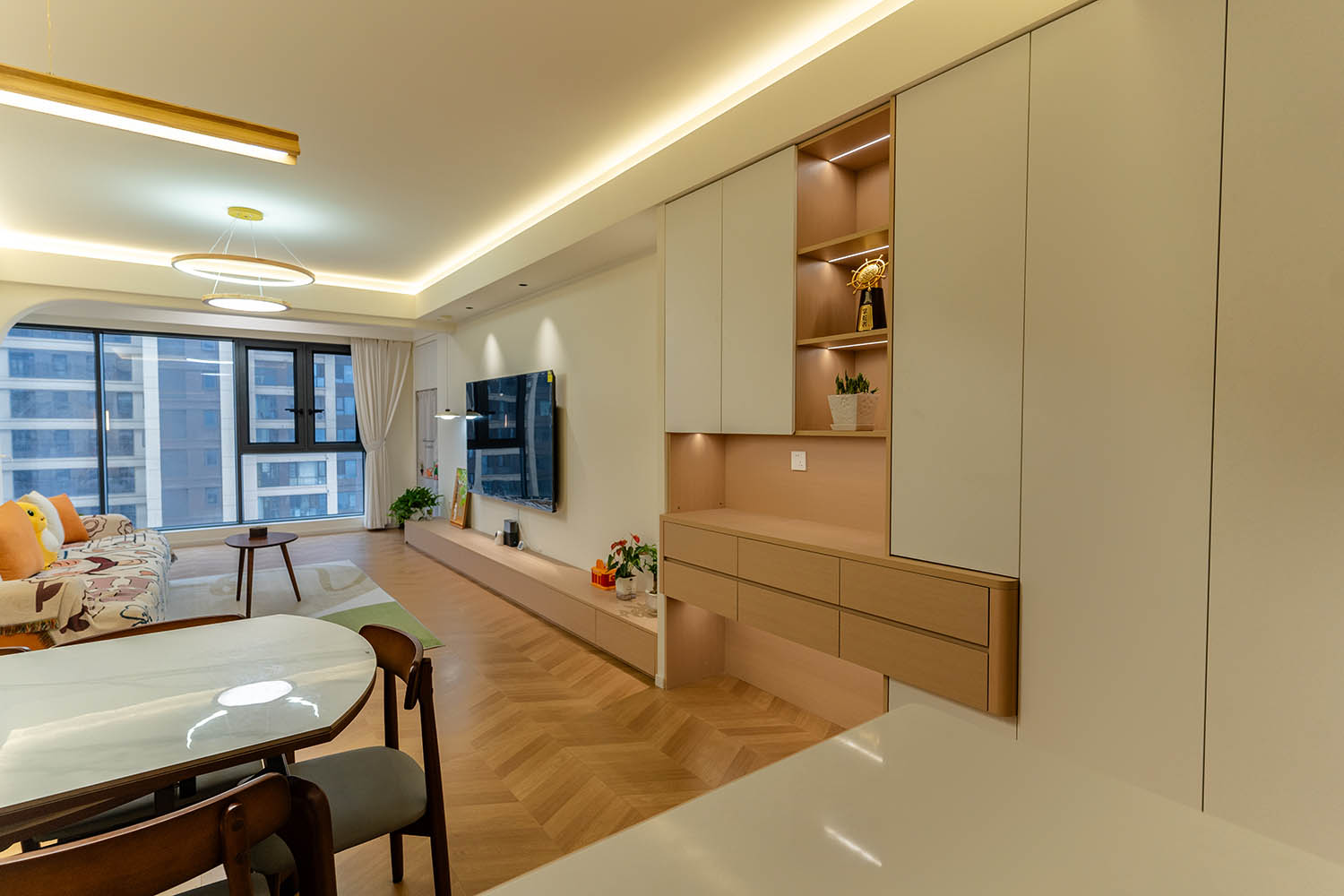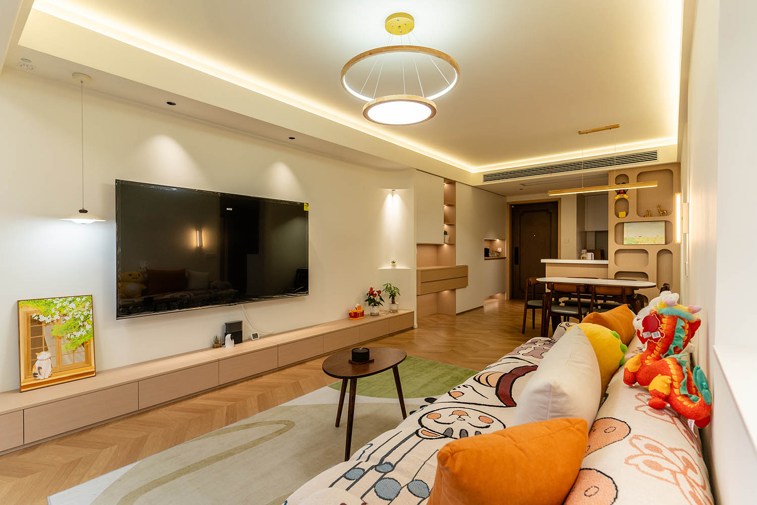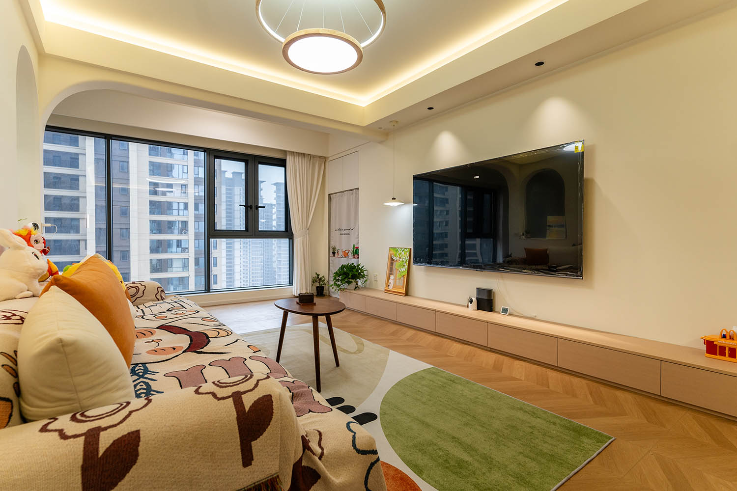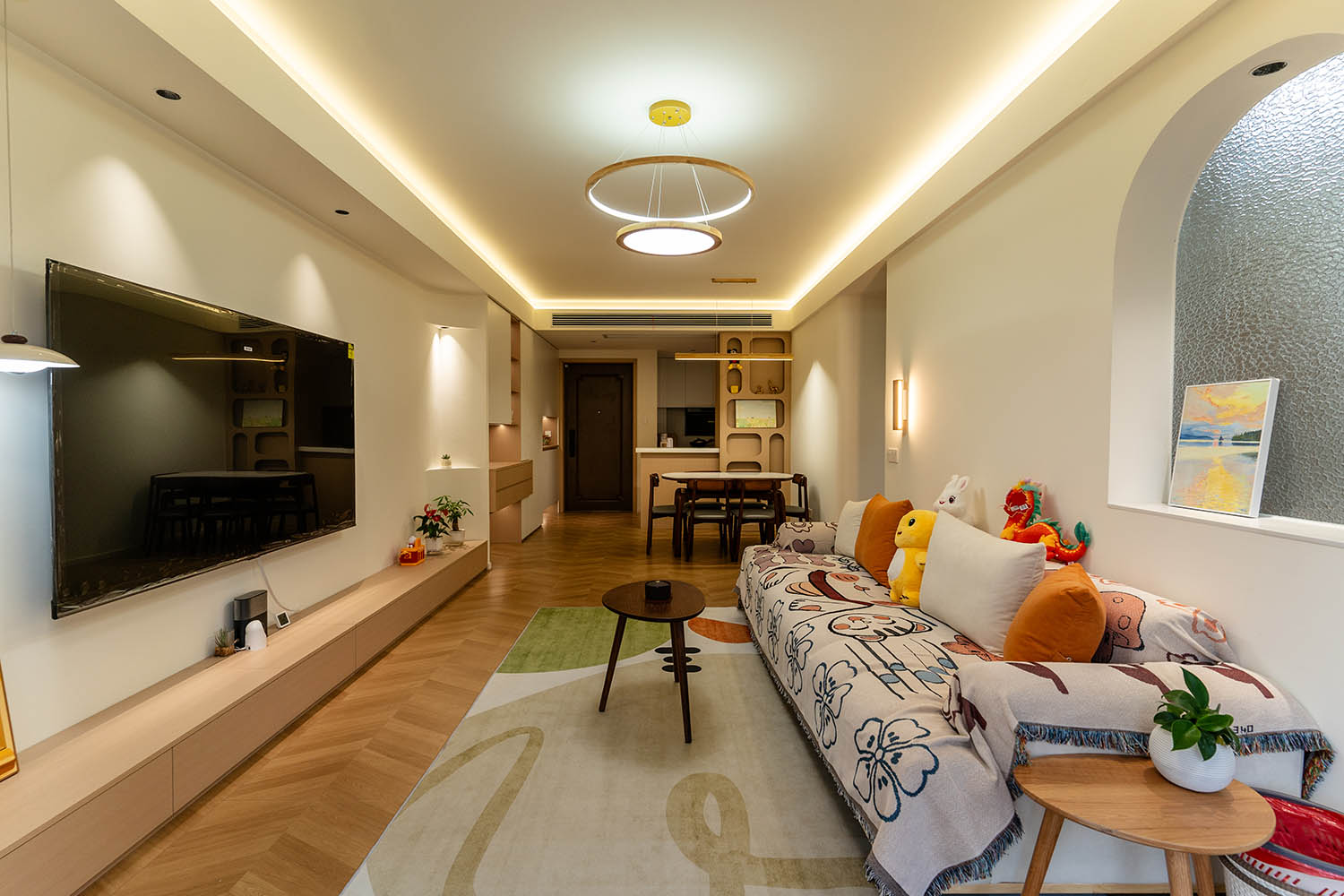 設計理念與空間基調(diào) 原木奶油風以低飽和度色彩、自然材質(zhì)與柔和線條為核心,在建發(fā)央著100㎡的戶型中,設計師通過奶油色基底與原木元素的融合,營造出溫暖治愈的居家氛圍。整體風格遵循“簡而不空”的原則,硬裝以簡約的幾何造型與流暢的動線為主,軟裝則強調(diào)材質(zhì)的天然感與舒適性,在實用性與美學之間找到完美平衡。 建發(fā)央著100㎡的原木奶油風,通過色彩、材質(zhì)與光影的巧妙平衡,將自然治愈感融入日常。既以開放式布局與智能收納滿足了現(xiàn)代生活的高效需求,又以弧形曲線與柔軟織物撫慰居者身心,真正詮釋了 “簡約中見細節(jié),溫柔中藏高級” 的居住理想。