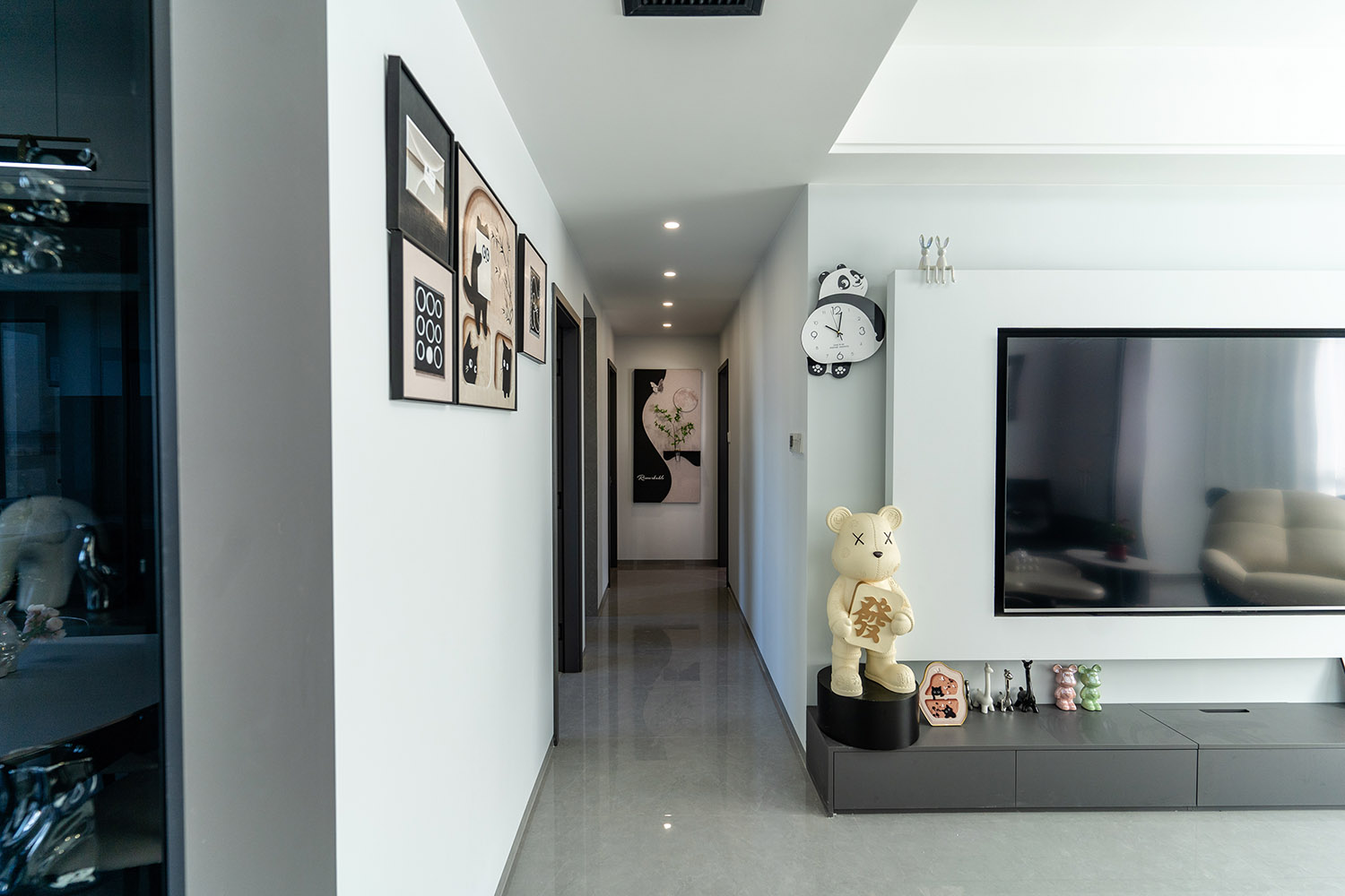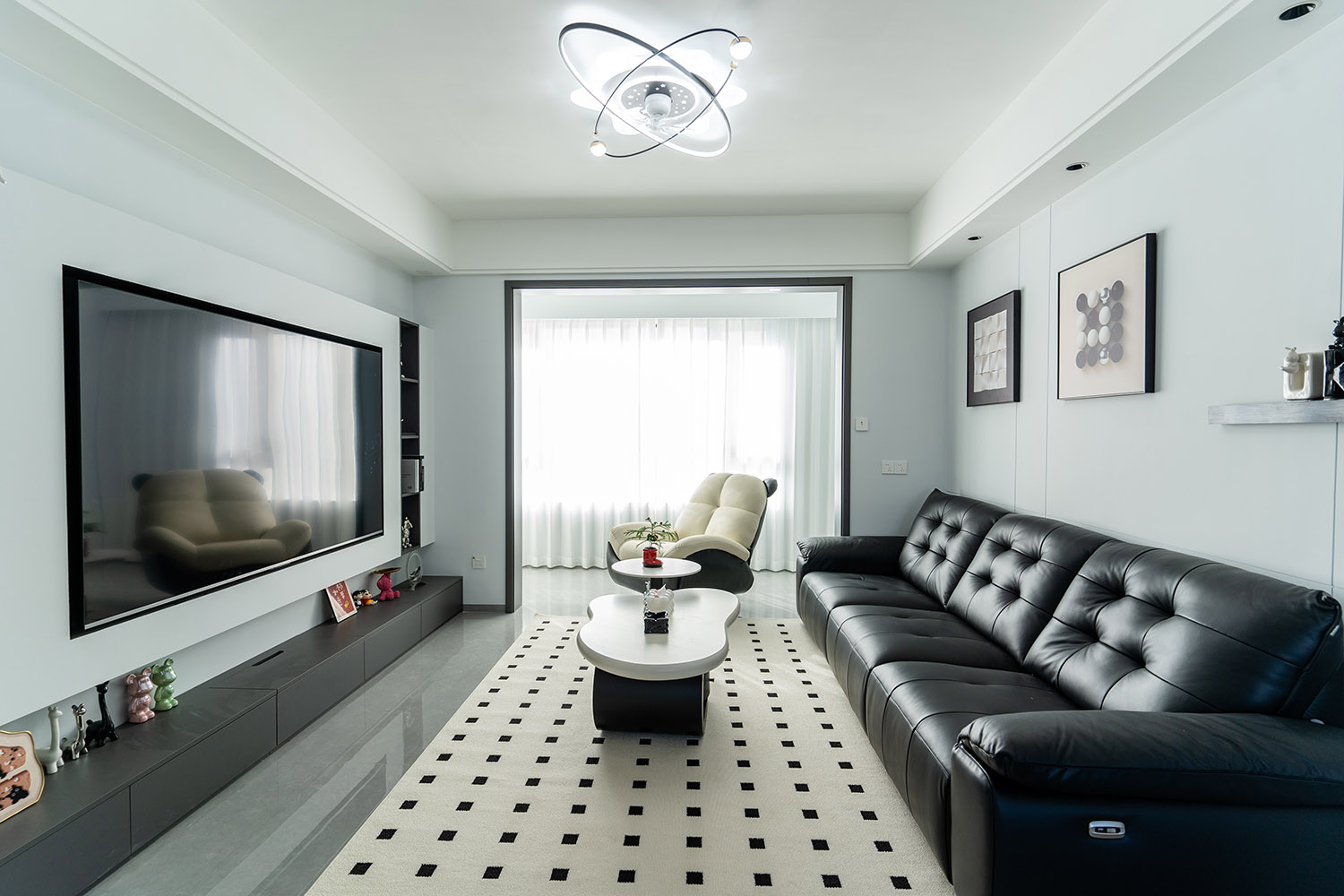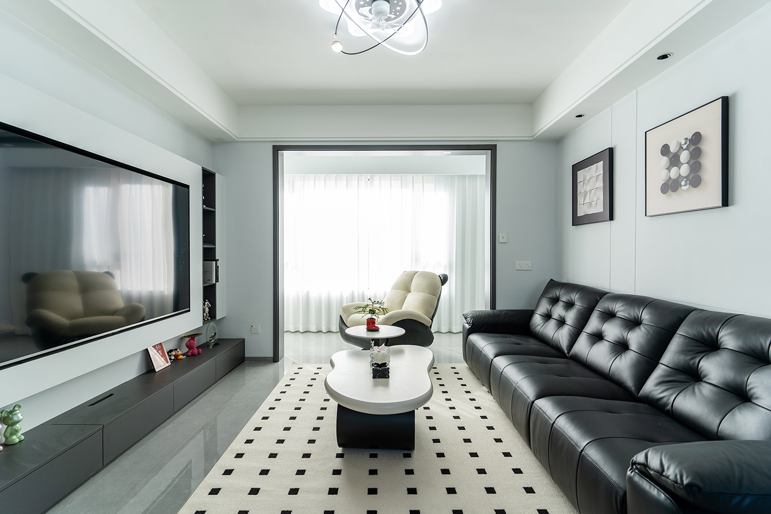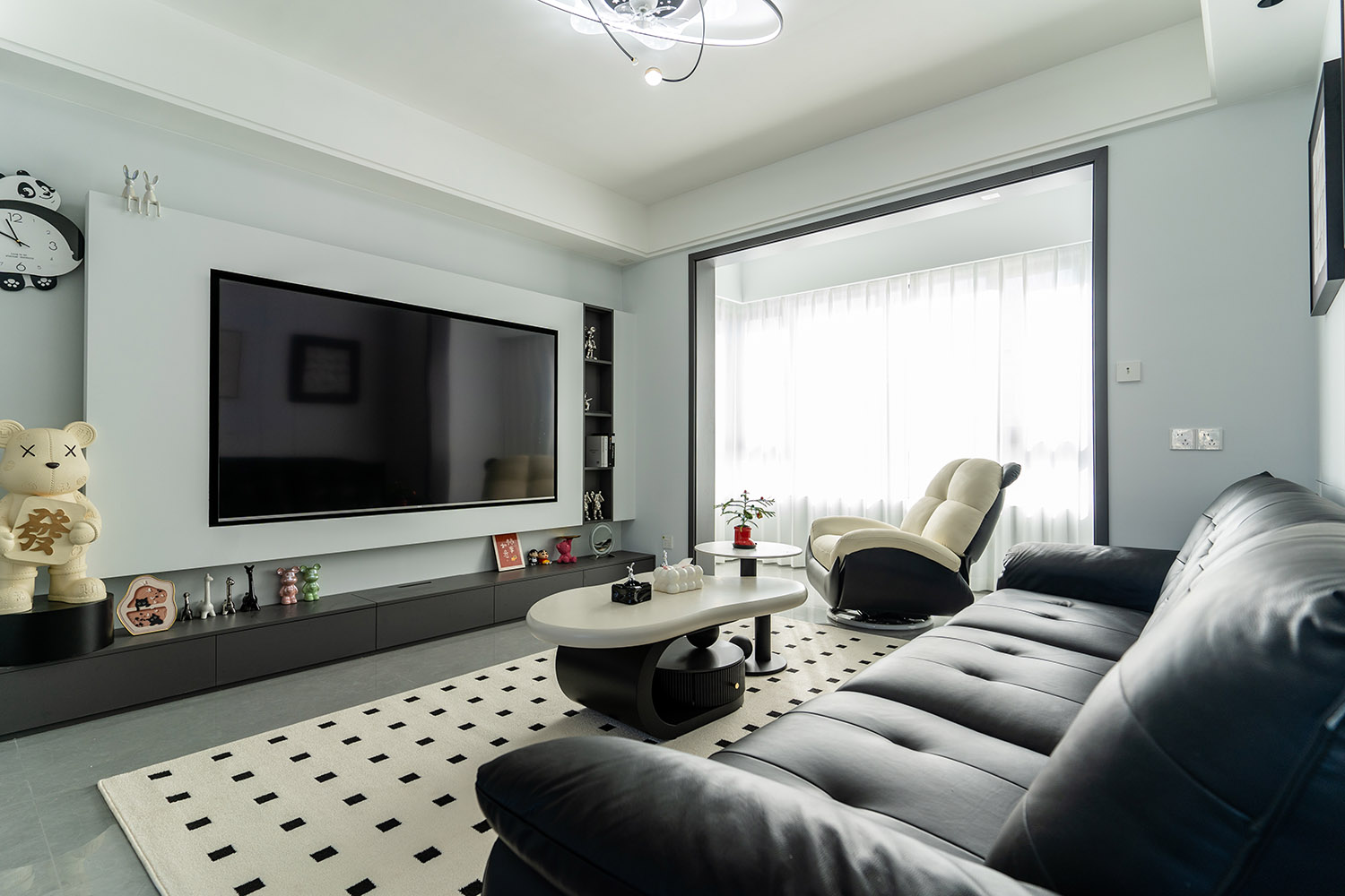 本案以“像素重組” 為核心理念,將136㎡的空間視作一個(gè)可以拆解與重構(gòu)的光影實(shí)驗(yàn)室。設(shè)計(jì)放棄所有裝飾性色彩,通過(guò)黑、白、灰三種基色的極致比例控制、不同材質(zhì)在單一色系下的質(zhì)感博弈以及精密計(jì)算的光影路徑,構(gòu)筑一個(gè)理性冷靜又充滿(mǎn)感知張力的未來(lái)居所。這里不是色彩的缺失,而是將色彩解構(gòu)為更本質(zhì)的光、影與肌理,讓居住回歸材料與空間的本質(zhì)對(duì)話(huà)。 通過(guò)極致的黑白灰控制與材料實(shí)驗(yàn),探索了現(xiàn)代居住的一種可能性:當(dāng)色彩被剝離,空間的形式、光影與質(zhì)感便被無(wú)限放大,人對(duì)空間的感知也因此變得更為敏銳和直接。它并非一個(gè)“冷淡”的空間,而是一個(gè)高度凝練、充滿(mǎn)理性之美并能包容居住者所有情緒與生活的“寧?kù)o背景板”。在這里,一幅畫(huà)、一株綠植、一本書(shū),乃至居住者本身,都將成為空間中最生動(dòng)、最富色彩的焦點(diǎn)。